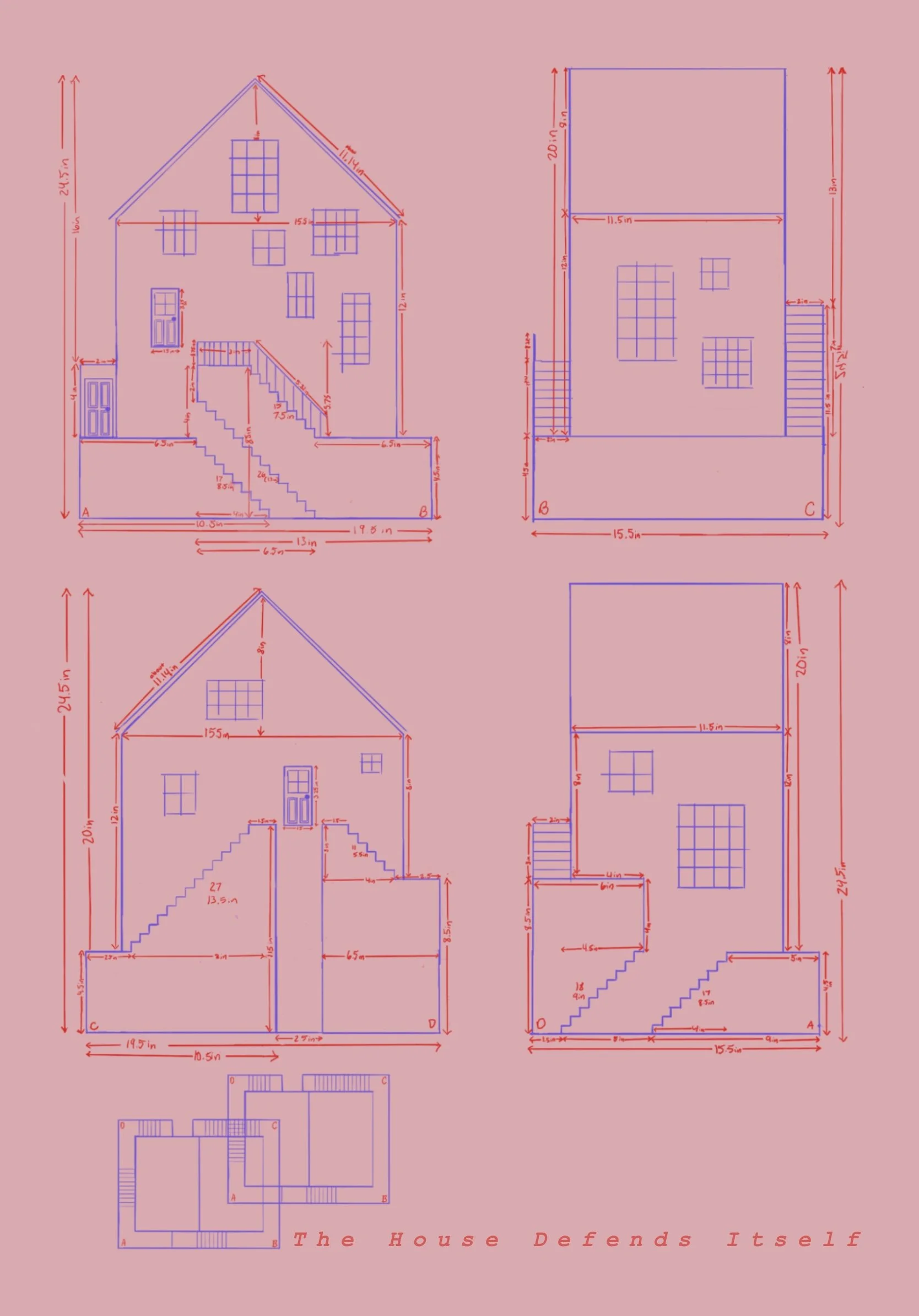 Plans for “The House Defends Itself” arranged into a show postcard. Designed with Photoshop and Procreate.