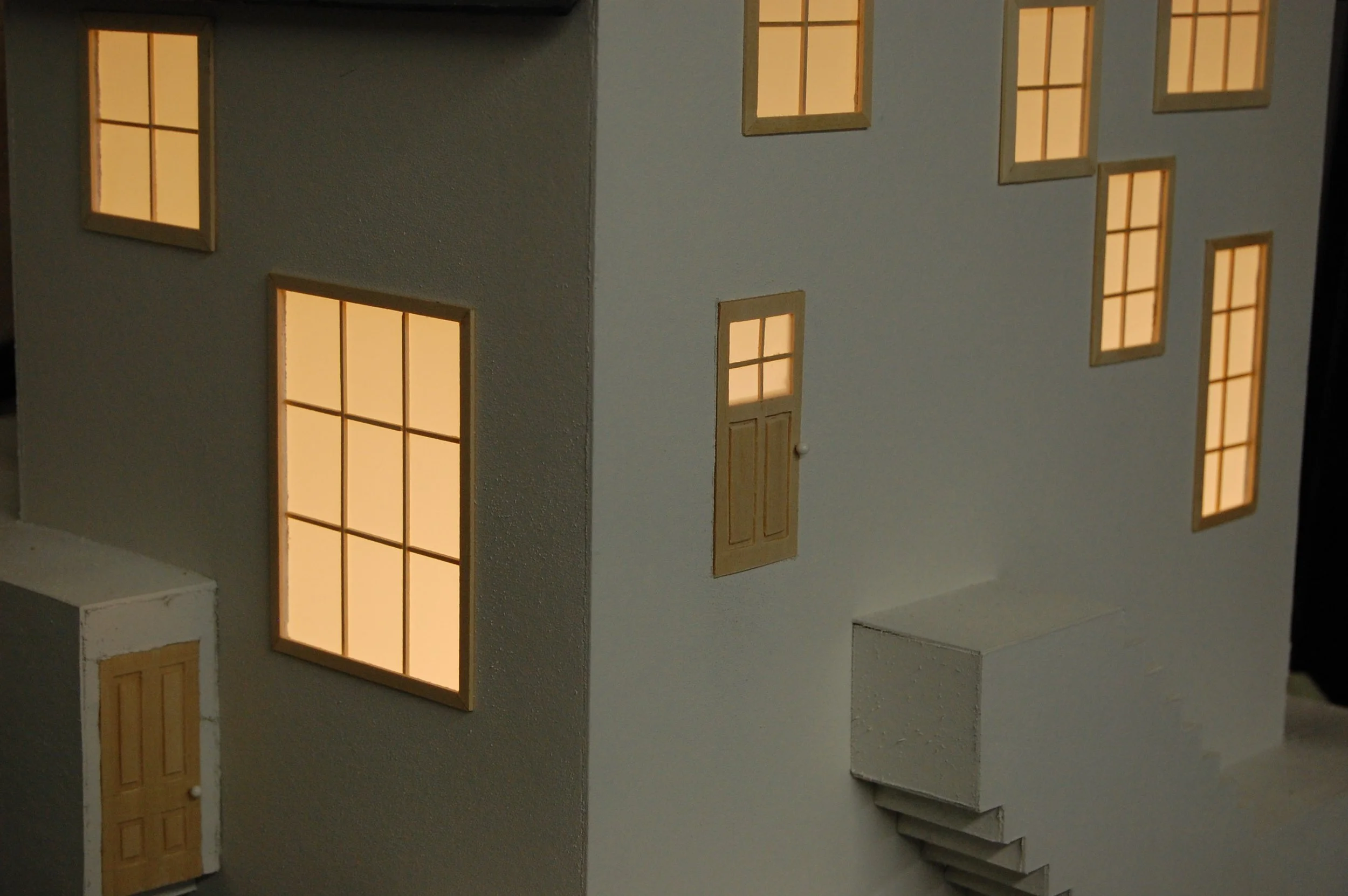 chip board, spray paint, wood glue, balsa wood, sewing pins, vellum, lamp